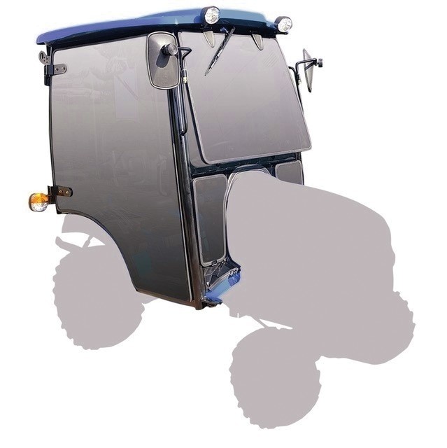 Original Komfort-Sicherheitskabine, mit 3-stufiger Lüftung und Heizung, zwei großen abschließbare Türen über die gesamte Seitenfläche, Heckscheibe kann für zusätzliche Belüftung geöffnet werden, 4-seitig getönte Sicherheitsverglasung, Frontscheibenwischer mit Waschanlage, zwei Rückspiegel, Sonnenblende, je zwei Arbeitsscheinwerfer (vorne und hinten), 12V-Steckdose, Vorbereitung für Rundumleuchte und Heckwischer, Kabinenhöhe ca. 196 cm. Das Leergewicht des Traktors mit aufgebauter Kabine erhöht sich von 750 kg auf 935 kg.
