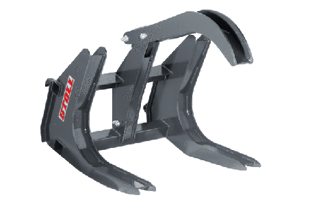 Polterzange, EURO Schnellwechsel-System. Mit zusätzlichem hydraulischem Obergreifer zum Festhalten der aufgenommenen Ware. Dritter Steuerkreis erforderlich (Montagekosten nach Aufwand).