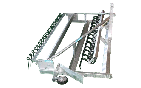 Reitplatzschleppe als feuerverzinkte Stahlkonstruktion, Arbeitsbreite 3,00 m, gerundetes Planschild, drehbar, Striegel höhenverstellbar mit auswechselbaren Zinken, Bandenführungsrolle.