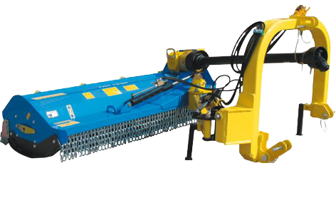 Seiten-Schlegelmäher 225 cm mit Standardgelenkwelle, hydraulische Verschiebung und hydraulische Neigung -50/+90 Grad, Freilauf im Getriebe, Stützkufen, “Y” Messer oder Hämmer, produziert in Europa mit CE.