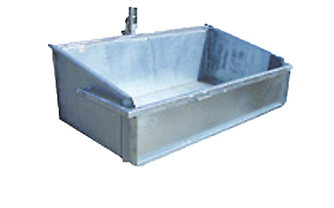 Transportcontainer mechanisch kippbar über Heckdreipunkthydraulik des Traktors, kompl. verzinkt, Arbeitsbreite 150 cm, mit Pendelbordwand, Kat. I, abgeschrägte Schürfkante, Tiefe innen 65 cm, Höhe 45/36 cm.