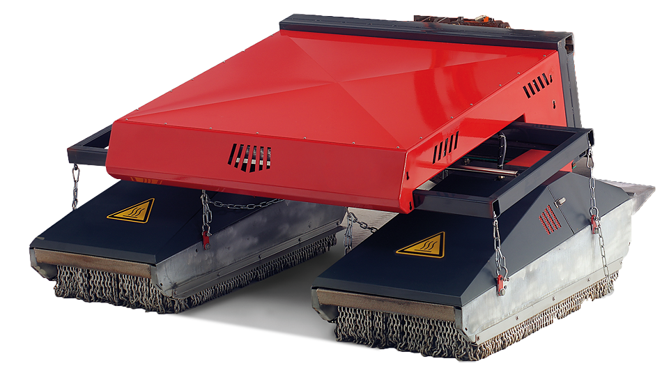 Thermischer Wildkrautentferner, Arbeitsbreite 2x 50 cm, elektrische Zündung, Leistung 123-246 kW – 5500 m² je Stunde, Gasverbrauch ca. 9-18 kg/Std., bestückbar mit 4 x 36 kg Gasflaschen.